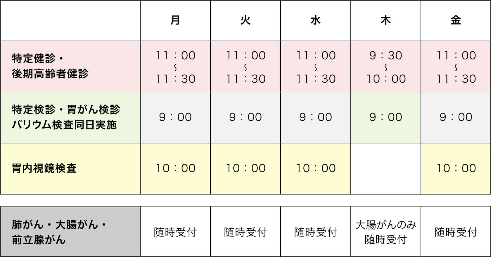 ・土曜日はスタッフ不足のため、特定健診、後期高齢者健診、胃バリウム検査、胃内視鏡検査の予約は行っておりません。